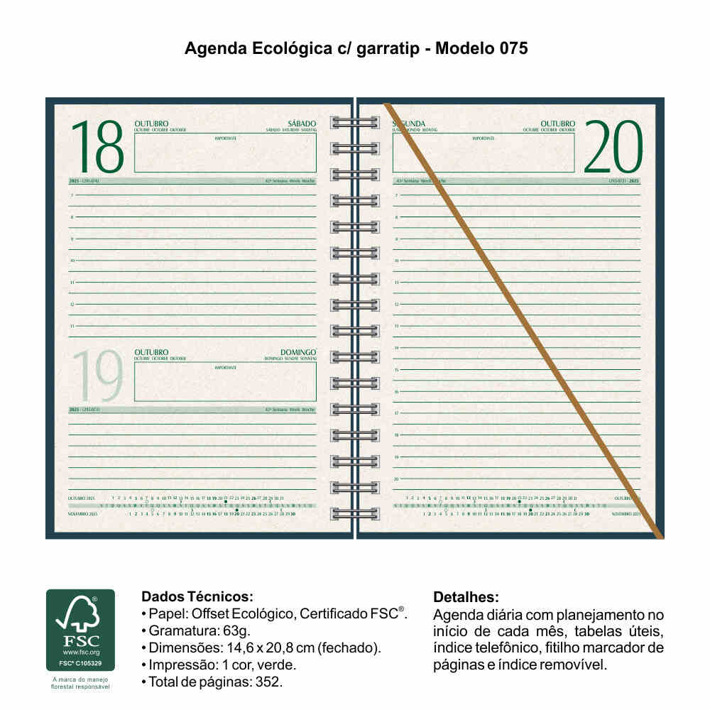 Opcionais: Cantoneiras, fitilho marcador de páginas, suporte para caneta, caneta, caneta personalizada, fecho elástico, lupa para leitura, envelope transparente e régua marcadora de 15cm.